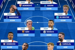 因伤缺席今年剩余比赛阵容:德布劳内、加维、卡瓦哈尔在列
