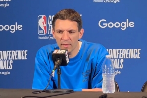 体育资讯5月25日讯 季后赛西部决赛G3,雷霆101-143惨败于森林狼。赛后主帅戴格诺特接受采访时森林狼球迷在附近嚎叫庆祝。