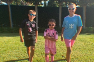 丽贝卡社媒晒出三个孩子的照片,孩子们都身穿迈阿密国际球衣。