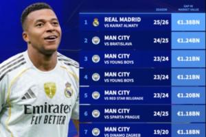 欧冠历史身价差距最大比赛排行↓(本赛季阿森纳对阵凯拉特交锋也将跻身榜单,但由于球员身价将在后续更新中调整,故暂未列入本次统计)