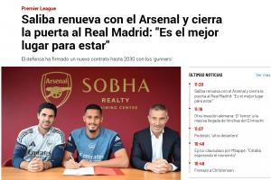 《阿斯报》的题目则是《官方:皇马错过萨利巴,阿森纳官宣与法国中卫续约至2030年,这名球员原本在皇马的引援计划中》