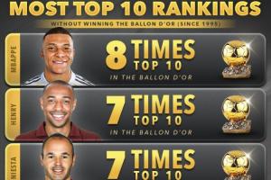 体育资讯10月07日讯 据外媒score90统计,姆巴佩8次入围金球奖前十,但从未获奖,历史最多。