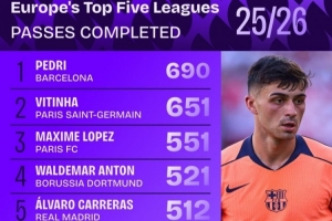 五大联赛球员传球次数排行: