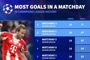 体育资讯10月23日讯 德国转会市场统计了欧冠单轮比赛进球数量,并列出欧冠历史单一轮次进球排名,本轮欧冠打进71球居首。
