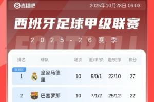 西甲积分榜:皇马10轮领先巴萨5分,黄潜第三,马竞第四