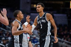 德克萨斯大学橄榄球队成员观战马刺 星三代曼宁与文班合影换球衣