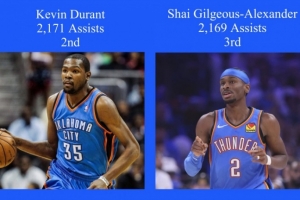 还差2个!今天打湖人SGA大概率将超越杜兰特升至队史助攻榜第二