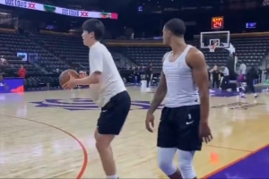 今日G联赛首秀!撕裂之城混音球员赛前热身 杨瀚森试投三分2中1