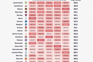 OPTA列英超未来5轮赛程困难度:热刺第6、阿森纳第9,军魔城倒三